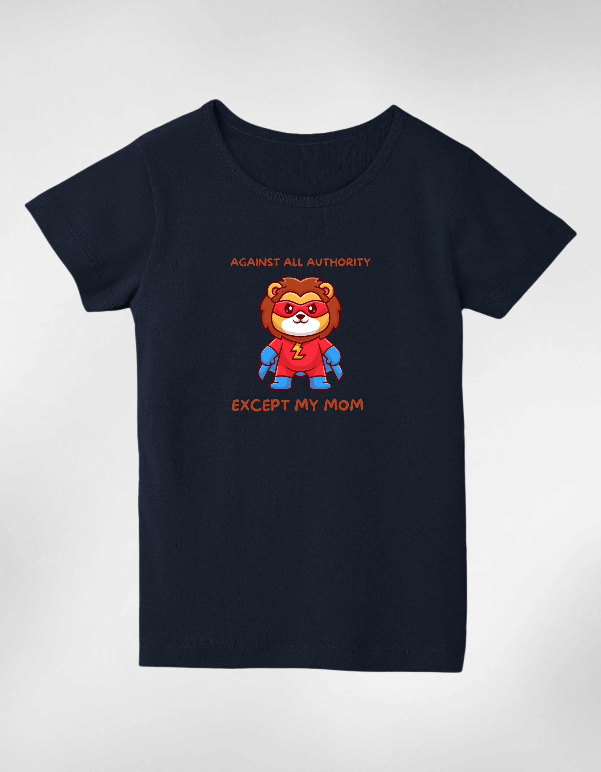 •Adorned with a bold and playful logo featuring a superhero lion and the phrase “Against All Authority Except My Mom.”